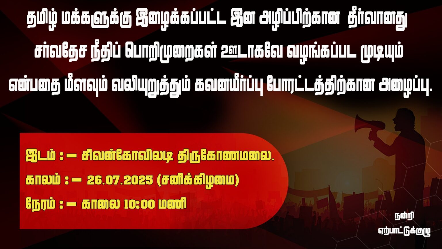நீண்ட காலமாக தமிழ் மக்கள் மீது திட்டமிடப் பட்ட வகையில் நடாத்தப்பட்டு வரும் இன அழிப்பிற்கு சர்வதேச நீதி கோரிய போராட்ட மானது வடக்கு கிழக்கு சமூக இயக்கத்தின் ஏற்பாட்டில் வடக்கு கிழக்கு எட்டு மாவட்டங்களிலும் எதிர்வரும் 26.07.2025 சனிக்கிழமை- நாளை காலை 10.00 மணிக்கு (ஒரே நேரத்தில் எட்டு மாவட்டங்களிலும்) நடாத்துவதற்கு திட்டமிடப்பட்டுள்ளது.