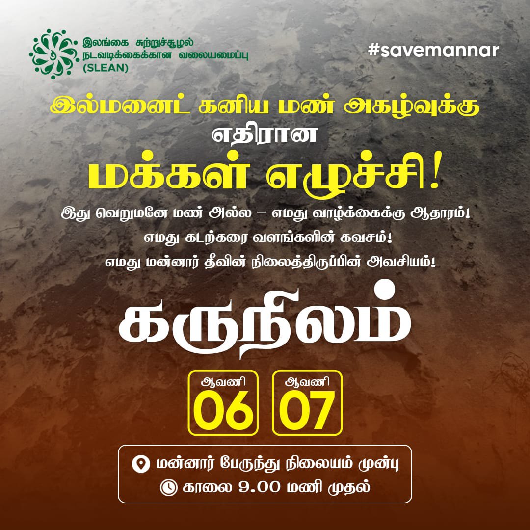 மன்னார் மாவட்டத்தில் கனிய மணல் அகழ்வுக்கு எதிராக சுற்றுச்சூழலை பாதுகாக்கும் நோக்கில் இளைஞர்கள் ஒன்றுபட்டு ஆகஸ்ட் மாதம் 06 , 07 ஆம் தேதிகளில் மன்னார் பேருந்து நிலையம் முன்பு கவன ஈர்ப்பு நிகழ்வொன்றை ஏற்பாடு செய்துள்ளனர்.