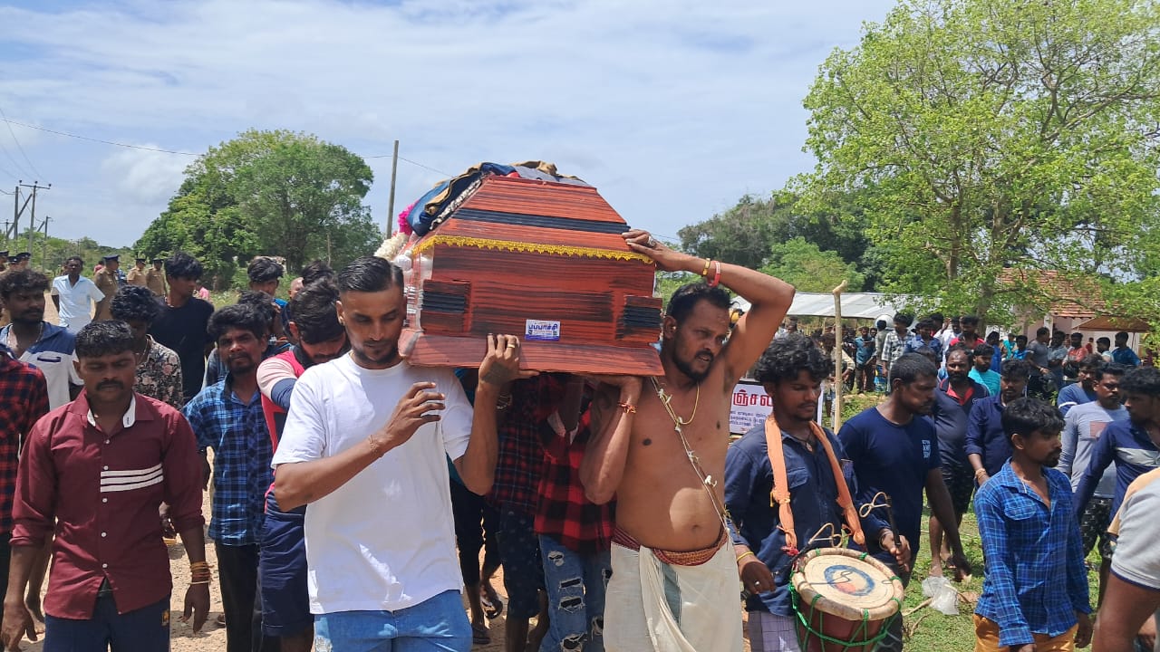 கடந்த வாரம் இலங்கை இராணுவத்தின் தாக்குதலுக்கு உட்பட்டு உயிரிழந்த 32 வயதான எதிர்மனசிங்கம் கபில்ராஜ் என்ற இளைஞனின் இறுதிச் சடங்கில், அவரின் குடும்பத்தினர், தமிழ் அரசியல் தலைவர்கள் மற்றும் பலர் கலந்து கொண்டிருந்தனர்.