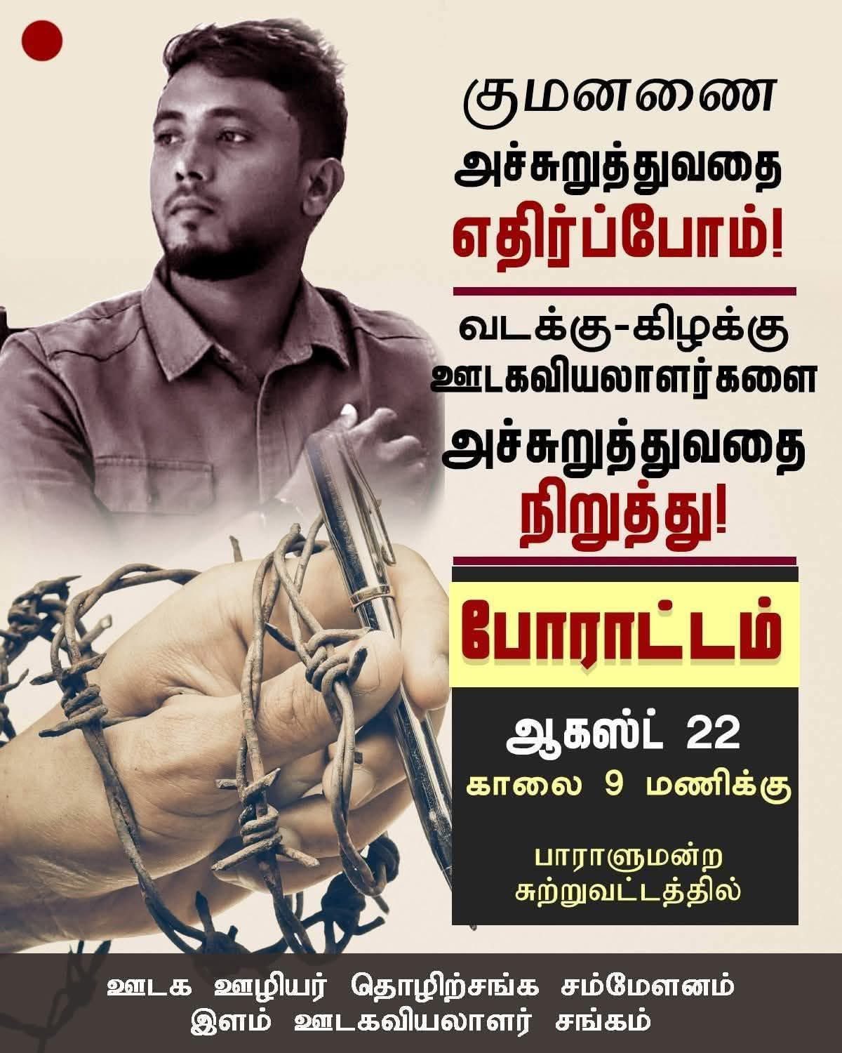 “குமணனை அச்சுறுத்துவதை எதிர்ப்போம்” என்ற கோஷத்துடன் ஊடக ஊழியர் தொழிற்சங்க சம்மேளனம் மற்றும் இளம் ஊடகவியலாளர் சங்கம் என்பன ஒன்றிணைந்து தலைநகர் கொழும்பில் ஆர்ப்பாட்டம் ஒன்றினை முன்னெடுக்கவுள்ளனர்.