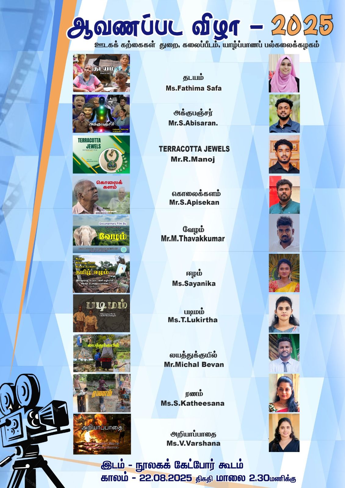 யாழ்ப்பாணப் பல்கலைக்கழக ஊடகக் கற்கைகள் துறை மாணவர்களால் தயாரிக்கப்பட்ட ஆவணப்படங்கள் 22 ஆம் திகதி வெள்ளிக்கிழமை பிற்பகல் 2.30 மணிக்கு பல்கலைக்கழக நூலகக் கேட்போர்கூடத்தில் திரையிடப்படவுள்ளன.