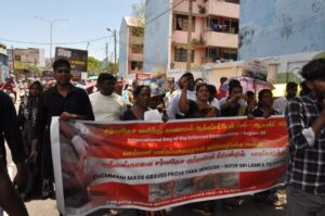 வலிந்து காணாமலாக்கப்பட்டோருக்கான சர்வதேச தினத்தை முன்னிட்டு சர்வதேச நீதியைக் கோரி வடக்கு கிழக்கு வலிந்து காணாமல் ஆக்கப்பட்டோரின் உறவுகளின் சங்கத்தினரால் வடக்கில் யாழ்ப்பாணம் கிட்டுப் பூங்காவில் இருந்து செம்மணி வரையும் கிழக்கில் பழைய கல்லடிப் பாலத்திலிருந்து காந்திப் பூங்காவரையும் மாபெரும் கவனயீர்ப்புப் போராட்டம் ஒன்று நேற்றைய தினம் முன்னெடுக்கப்பட்டமை குறிப்பிடத்தக்கது.