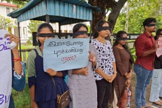 திருகோணமலை மாநகர சபை முன்றலில் கண்களைக் கட்டியபடி இளைஞர்கள் போராட்டத்தில்!!